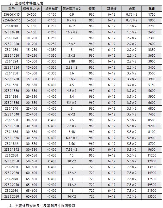 (1)敝開型(ZSG-□×□)為座式,無防塵蓋板,結構,用于大篩分能力、無粉塵污染的顆粒物料的篩分作業